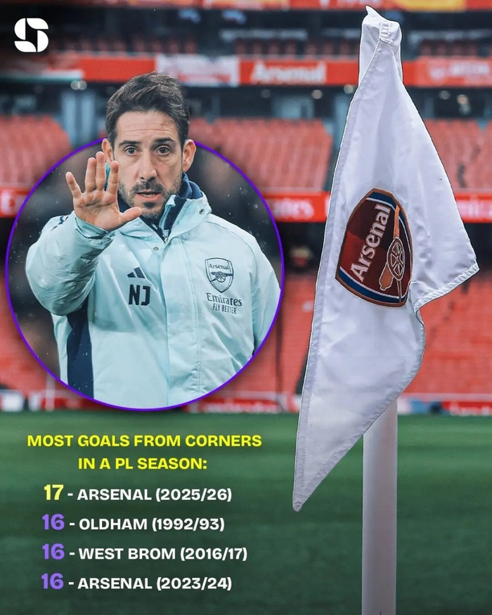 本赛季英超阿森纳已通过角球打入17球,创造英超新的历史纪录