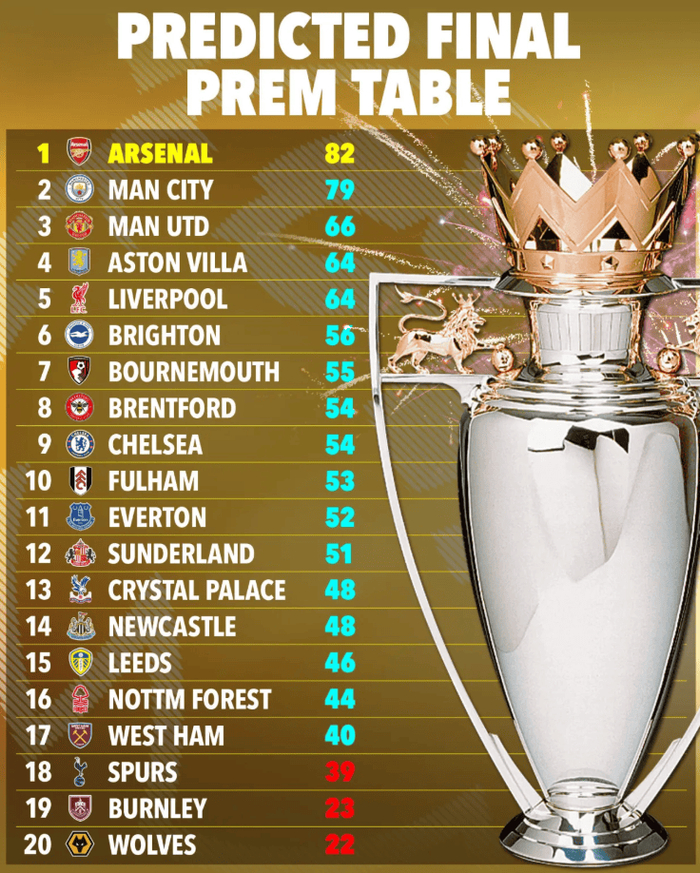 超级计算机还预测,阿森纳和曼城,在剩余比赛中都不会取得全胜。阿森纳最后4轮预计取得3胜1负,最终积82分;曼城还剩5轮联赛,但预计将输掉其中2场,最终积79分。