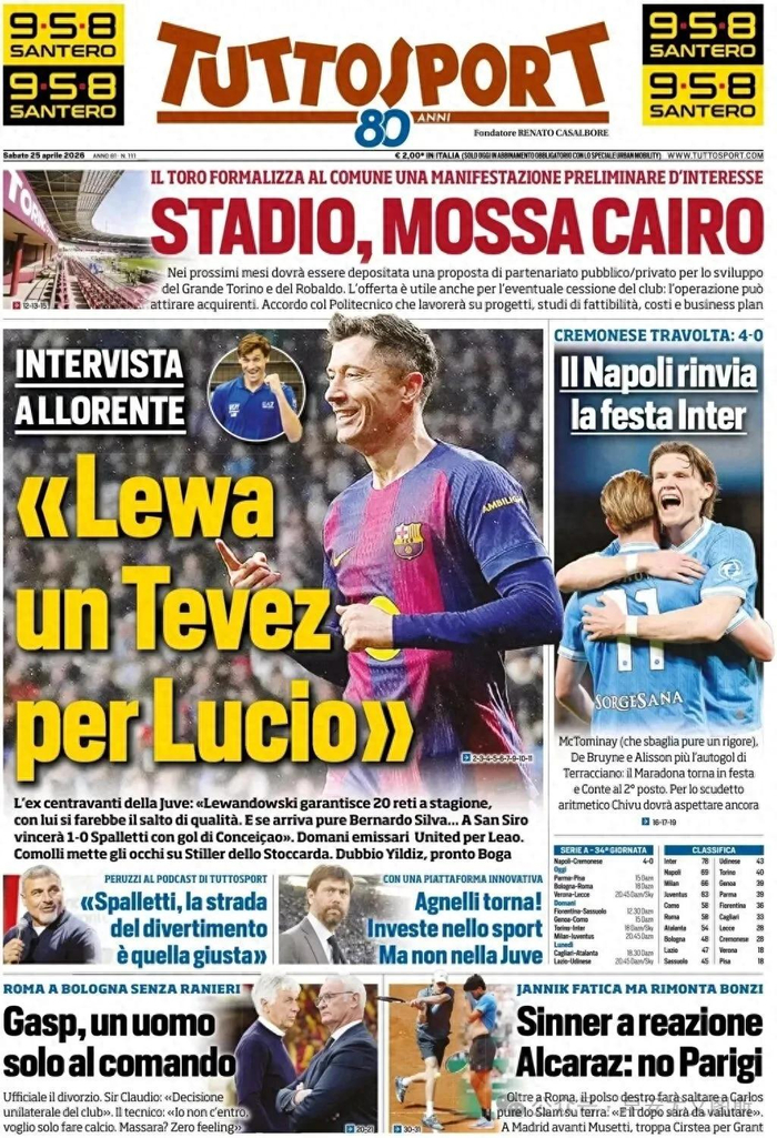 2、孔蒂推迟了派对。那不勒斯的反应:4比0摧毁克雷莫内塞,安东尼奥已经接近确保欧冠资格。麦克托米奈推迟了国际米兰的联赛冠军,对阵拉齐奥全场比赛没有射门中框的蓝军,昨晚在上半场就有14脚射门。苏格兰人首开纪录,然后特拉恰诺自摆乌龙,德布劳内和阿利森也破门得分。齐沃明天作客对阵都灵,冠军可能在5月3日对阵帕尔马后获得。
